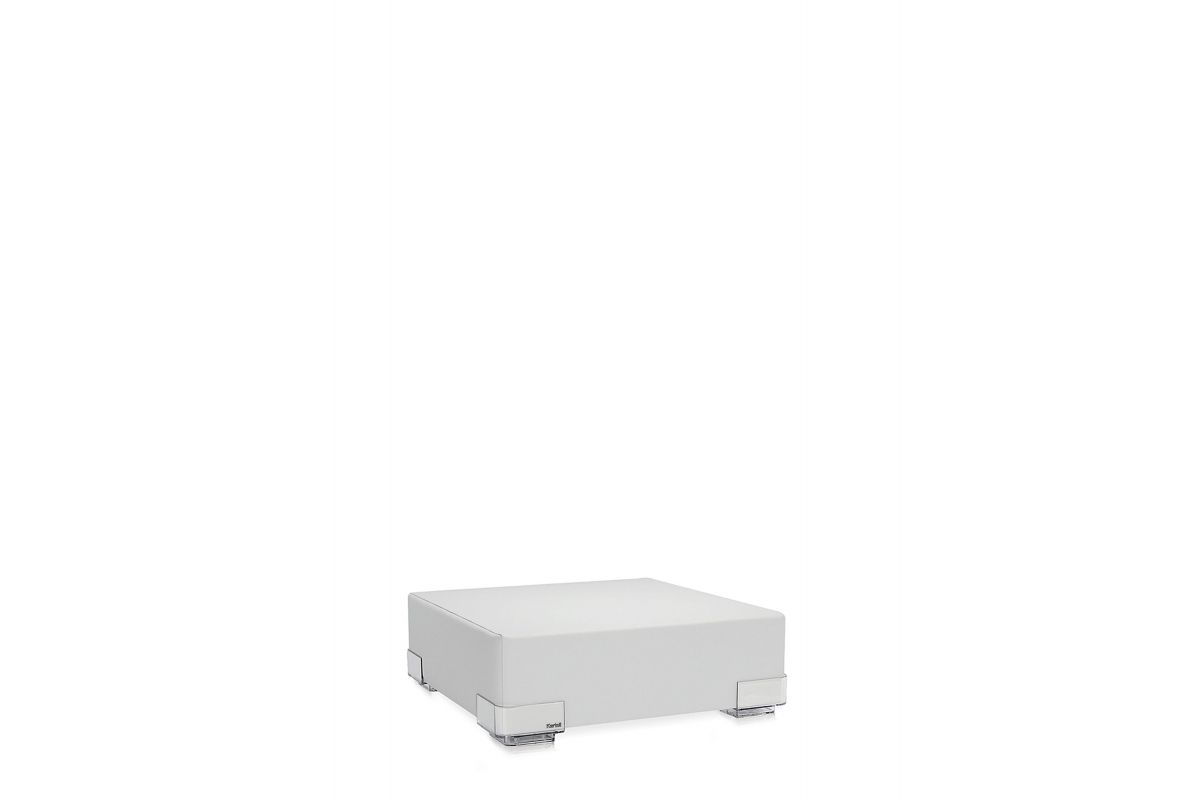 Le pouf : un coussin en polyuréthane souple. La ligne minimaliste est complétée par quatre pieds en polycarbonate transparent.