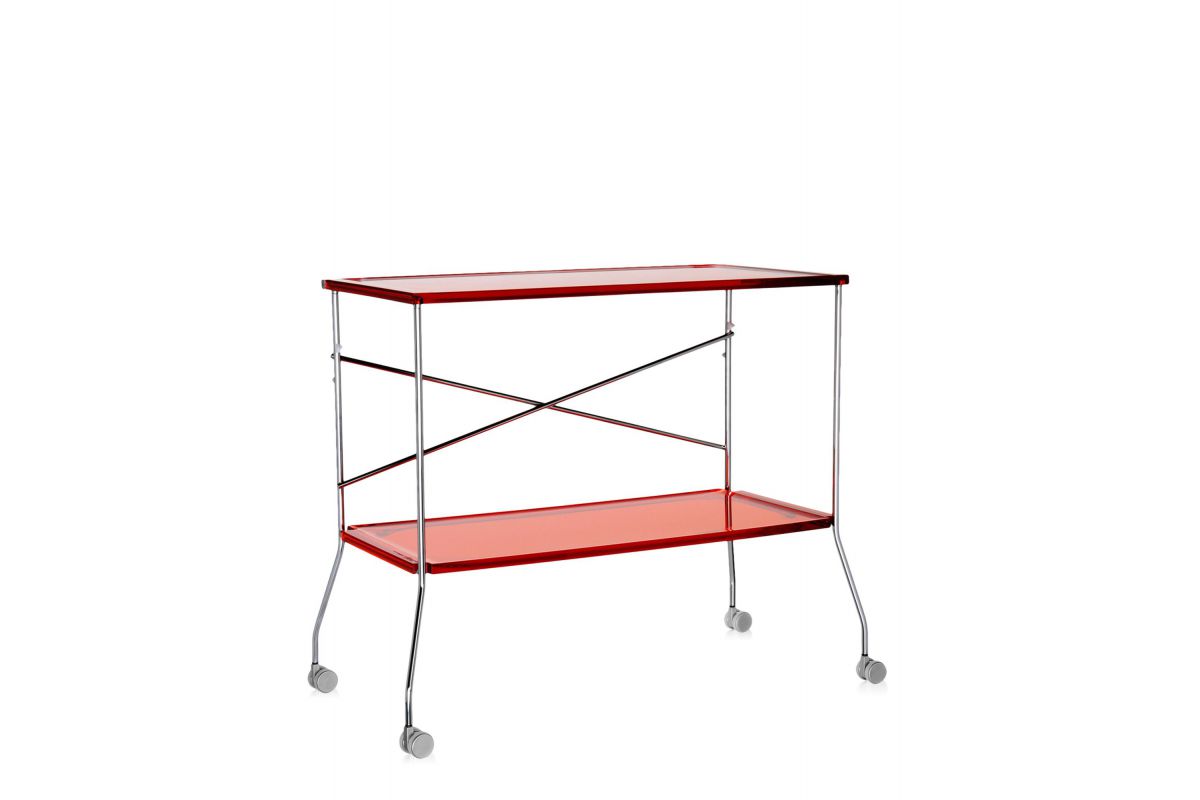 Kartell amène la transparence jusque dans le monde des chariots : voici Flip, un chariot pliant qui allie le matériau plastique transparent des plateaux et le métal de la structure.